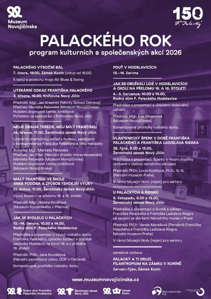 Rok 2026 se nese ve znamení 150. výročí úmrtí Františka Palackého, „Otce národa“. Muzeum Novojičínska spolu se svými pobočkami a partnerskými institucemi při této příležitosti připravilo pestrý a bohatý program pro širokou veřejnost.