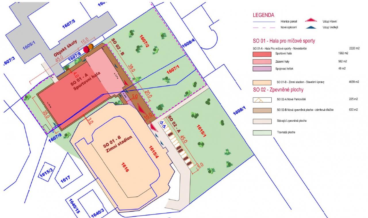 Součástí připravované dokumentace je vybudování nových parkovacích míst v blízkosti vstupu do sportovní haly. Jelikož stavbou sportovní haly dojde ke zmenšení stávající školní zahrady u ZŠ Sjednocení v zadní části, tak bude školní zahrada rozšířena v přední části o stávající veřejný prostor až k chodníku, který vede kolmo k budově zimního stadionu.