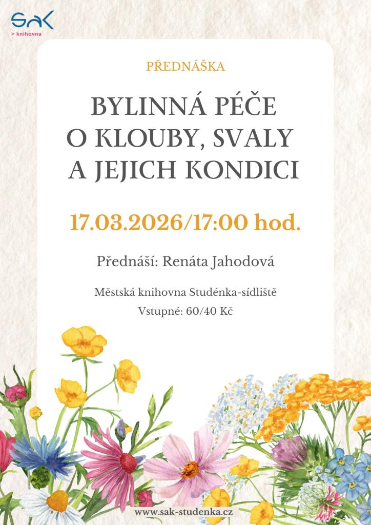 Mobilní svaly a klouby nejsou jen otázkou vysportovaného těla, ale hlavně těla udržovaného v té nejlepší kondici. Na přednášce si řekneme, jaké byliny, výrobky z nich a postupy udrží naše svaly a klouby v té nejlepší formě. Propojíme část fyzickou, mentální a emocionální, protože to vše jejich stav ovlivňuje. Dostanete návod i recept na to, co je vhodné jak pro sportovce, děti či dospělé, tak po ty, kteří trpí revmatem, artrózou a artritidou.