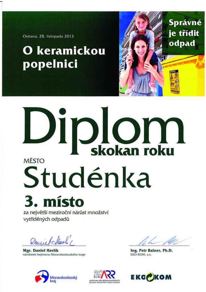 Město Studénka dosáhlo krásného úspěchu ve vyhodnocení třídění odpadu a získalo 3. místo v kategorii „skokan roku" v soutěži O keramickou popelnici 2013 v třídění plastů, papíru, skla a nápojových kartonů, a to s 24% nárůstem vytříděného odpadu oproti roku 2012 (vítězem této kategorie se staly Petrovice u Karviné s nárůstem 34%, na druhém místě Rýmařov s nárůstem 27%).