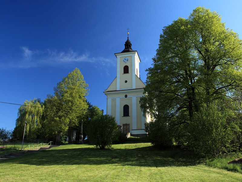 Jednolodní pozdně barokní podélný kostel s odsazeným, půlkruhově uzavřeným presbyteriem, vybudovaný na místě staršího dřevěného kostelíka v letech 1775 – 1781. Průčelí kostela je výsledkem stavebních úprav, které probíhaly kolem roku 1830. Kostel stojí na návrší, na vysoké podnoži, která vyrovnává svažitost terénu. Interiér kostela je zdoben cennými oltářními obrazy fulneckého malíře J. G. Frommela z let 1788-1789.