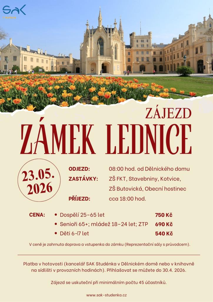 Hlavním bodem programu bude návštěva zámku Lednice, kde absolvujete komentovanou prohlídku reprezentačních sálů. Po prohlídce bude dostatek prostoru na individuální procházku zámeckým parkem, posezení v kavárně nebo krátký odpočinek v přírodě.